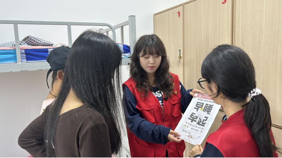 活动前期,通过发布通知和推文的形式,详细介绍活动流程与核心价值。活动当天,30余名志愿者手持主题宣传海报深入宿舍公寓楼,面对面为同学们讲解早睡早起对身心健康、学习效率的重要意义。此外,活动期间每日晚间安排志愿者开展宿舍巡查,重点排查吵闹等影响休息的情况,全力维护安静有序的夜间宿舍环境。