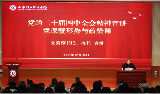 为深入学习贯彻党的二十届四中全会精神,切实将师生思想和行动统一到党中央决策部署上来,12月24日,山东轻工职业学院党委副书记、校长袁雷在文昌湖校区励行书院开展党的二十届四中全会精神宣讲党课暨形势与政策课。信息工程系、嘉环ICT产业学院全体教职工及150名学生代表参加宣讲会,信息工程系党总支书记房屹主持会议。