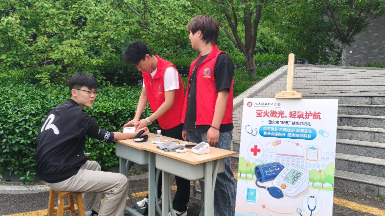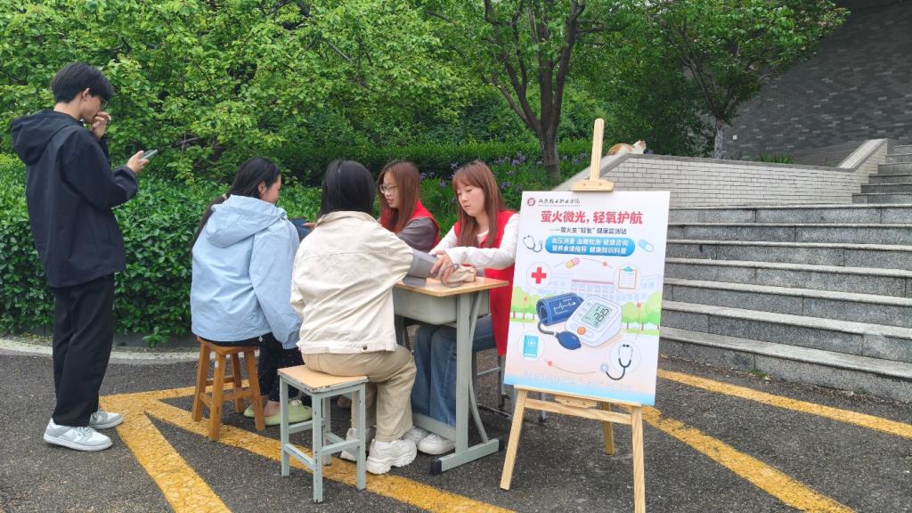 为切实提升学生健康素养与自我保健意识,4月16日,健康管理系红烛苗圃“一站式”学生社区“萤火虫·轻氧”健康监测站在9号学生公寓门口开展“萤火微光,轻氧护航”健康义诊志愿服务活动。