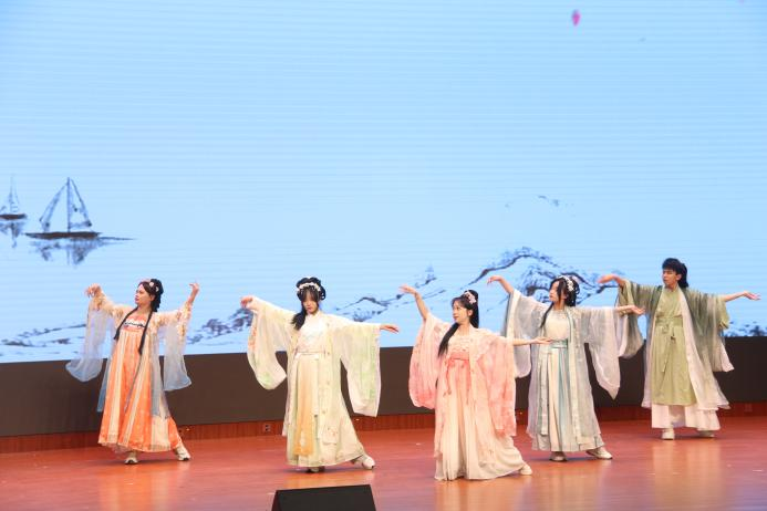 霓裳羽衣汉服社亮相学校“一站式”学生社区建设颁奖活动,带来精彩汉服舞蹈表演《与君书》。社员身着传统服饰,舞姿优雅、气韵生动,以古典之美展现传统文化魅力,为颁奖仪式增添独特风采,彰显青年文化自信。
